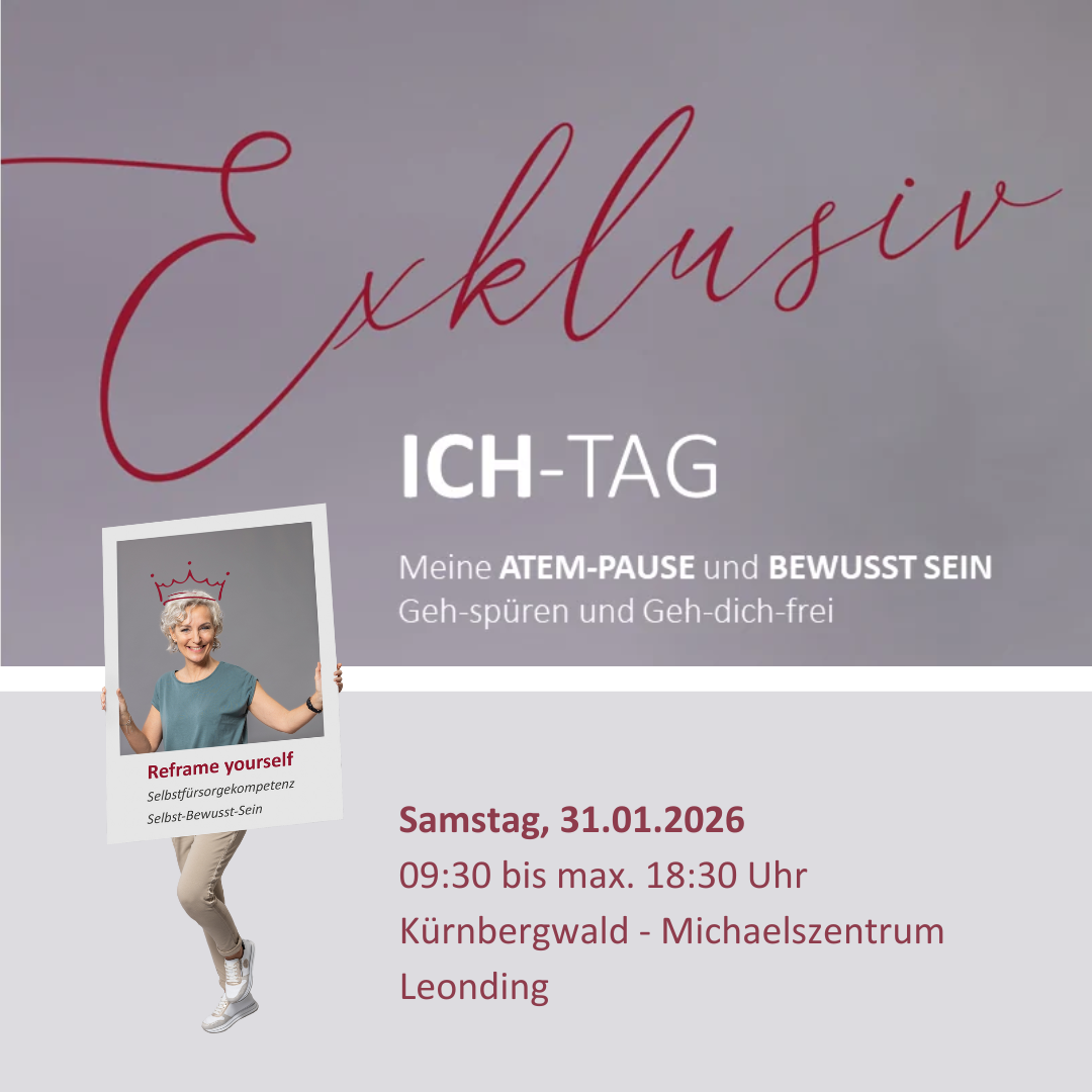 Exklusiv ICH-Tag Meine ATEM-PAUSE und BEWUSST SEIN Geh-spüren & Geh dich frei | Gehen mit den Jahreszeiten Innehalten | Innere Prozesse begleiten | Schätze entdecken OUTDOOR & INDOOR Selbstfürsorge ist ganzheitliche Gesundheitsvorsorge. [...]